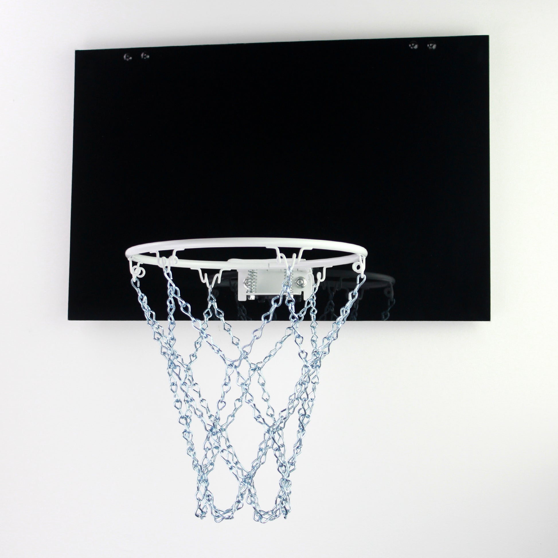 Transform any room into a mini basketball court with this sleek and modern indoor basketball hoop set. The white rim and black backboard combination offers a minimalist aesthetic that compliments contemporary decor. Set includes: