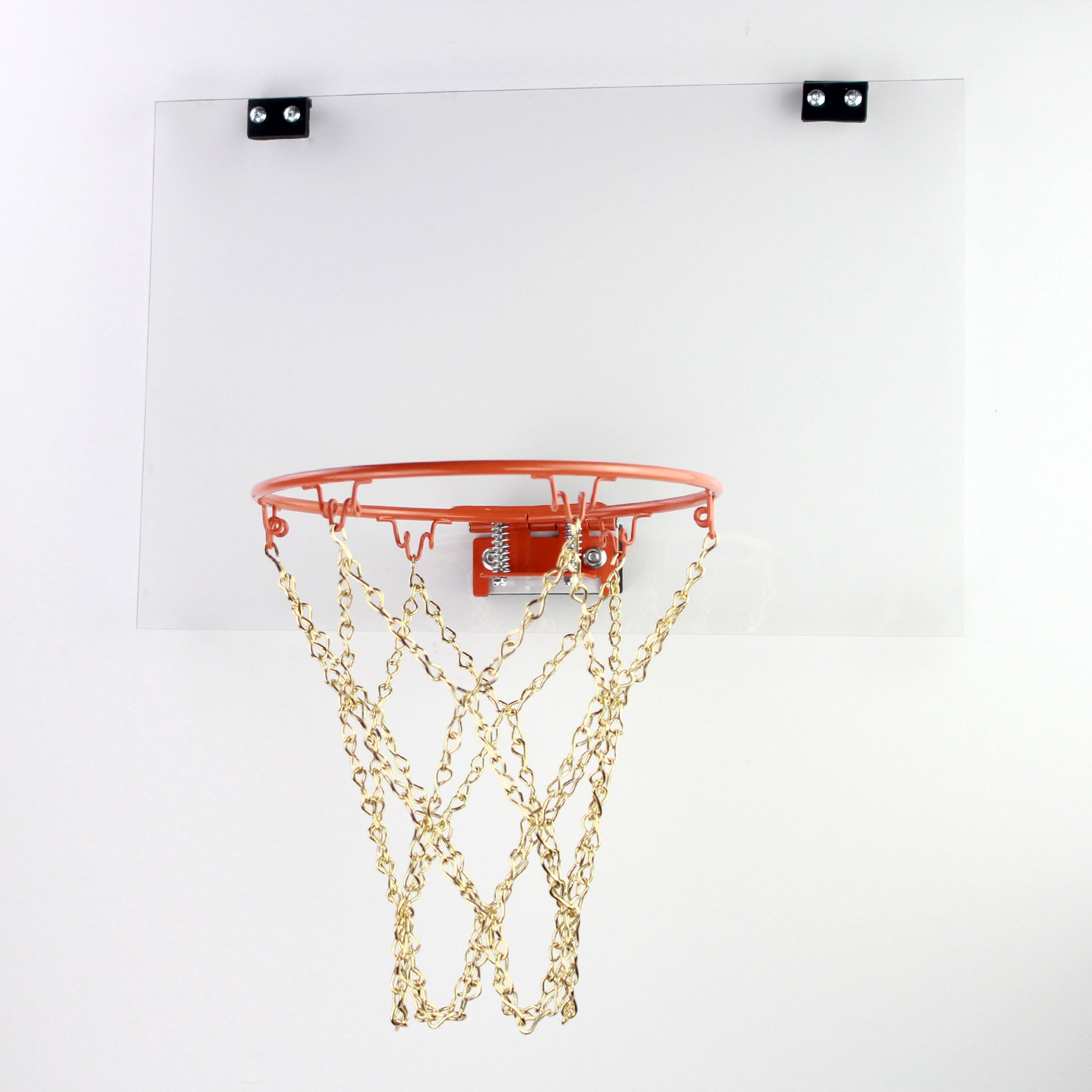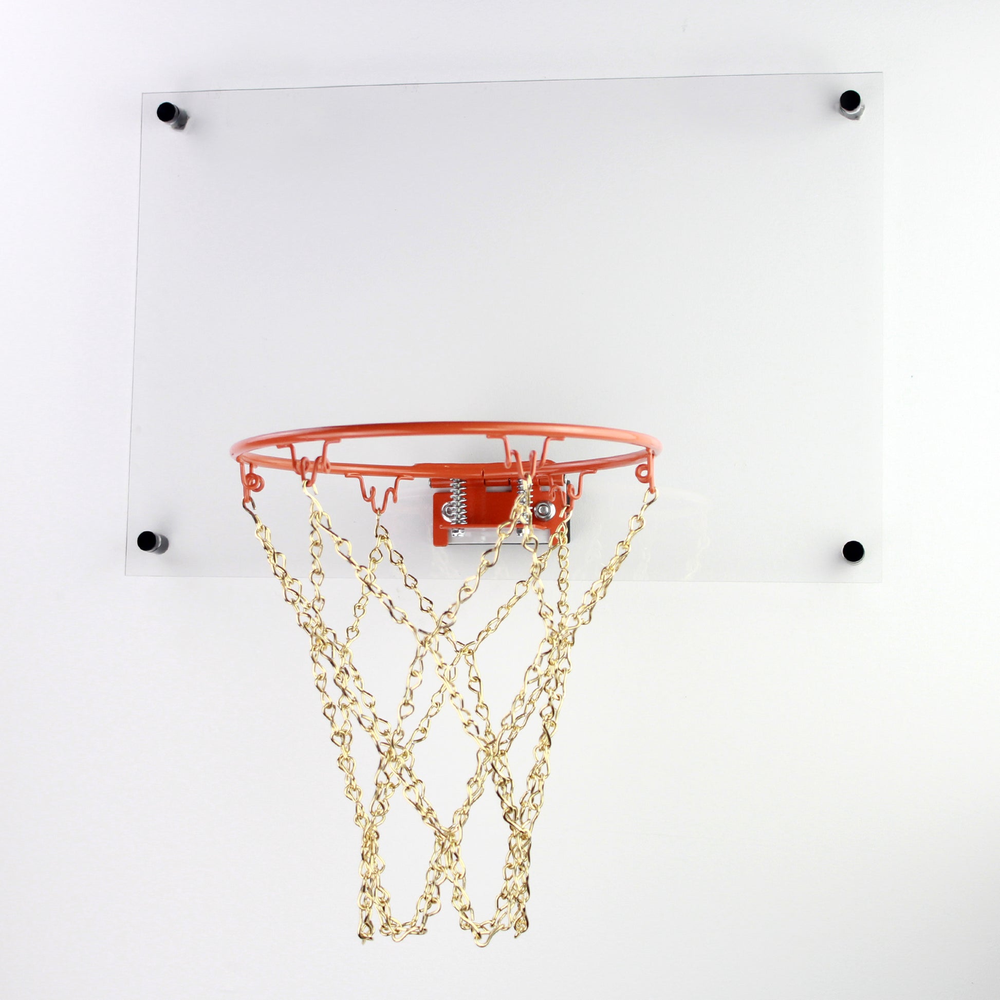 Transform any room into a mini basketball court with this sleek and modern indoor basketball hoop set. The orange rim and clear backboard combination offers a minimalist aesthetic that compliments contemporary decor. Set includes: