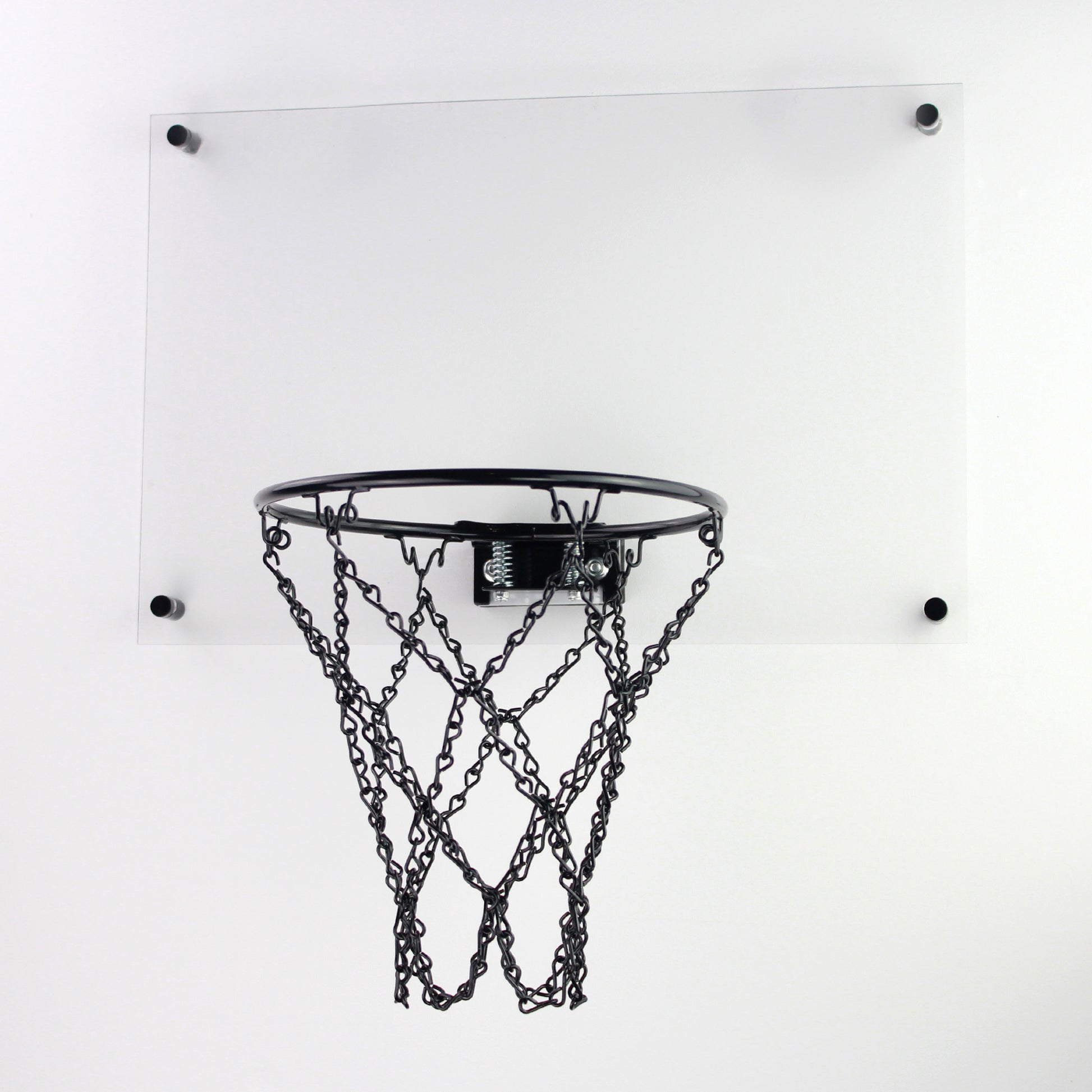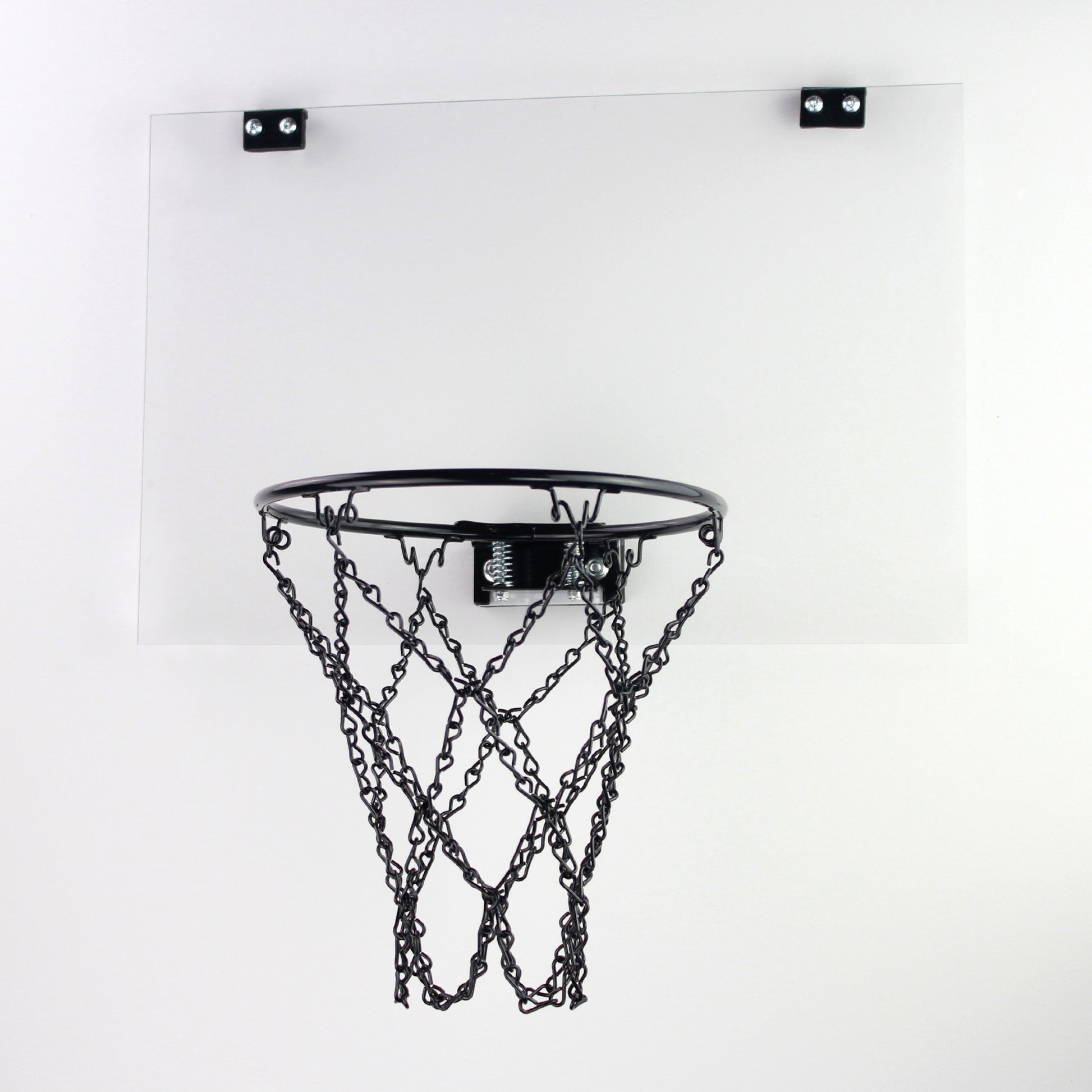 Transform any room into a mini basketball court with this sleek and modern indoor basketball hoop set. The black rim and clear backboard combination offers a minimalist aesthetic that compliments contemporary decor. Set includes: